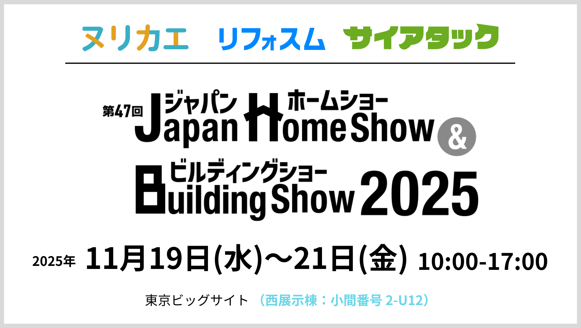 11/19(水)~21日(金)ヌリカエ/リフォスム/サイアタック、第47回ジャパンホームショー&ビルディングショー出展(東京ビッグサイト 西展示棟)
