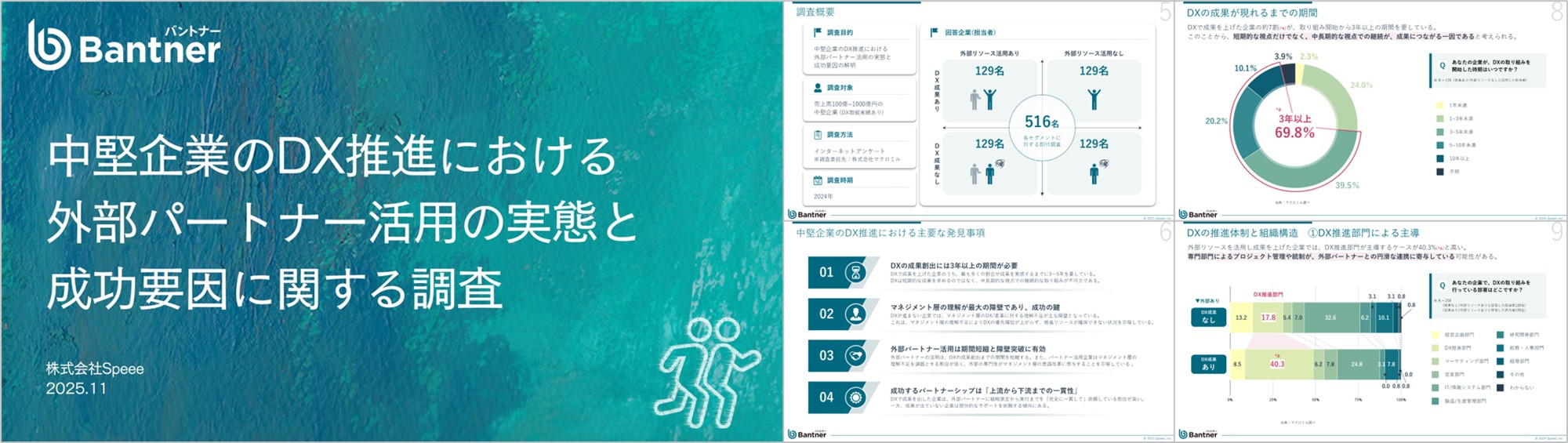 株式会社Speee(本社:東京都港区、代表取締役:大塚英樹、東証スタンダード:4499)の提供する伴走型コンサルティングサービス「バントナー(https://bantner.speee.jp/)」が、日本の中堅企業のDX推進における外部パートナー活用の実態と、その成功要因に関するホワイトペーパーの展開を開始しました。