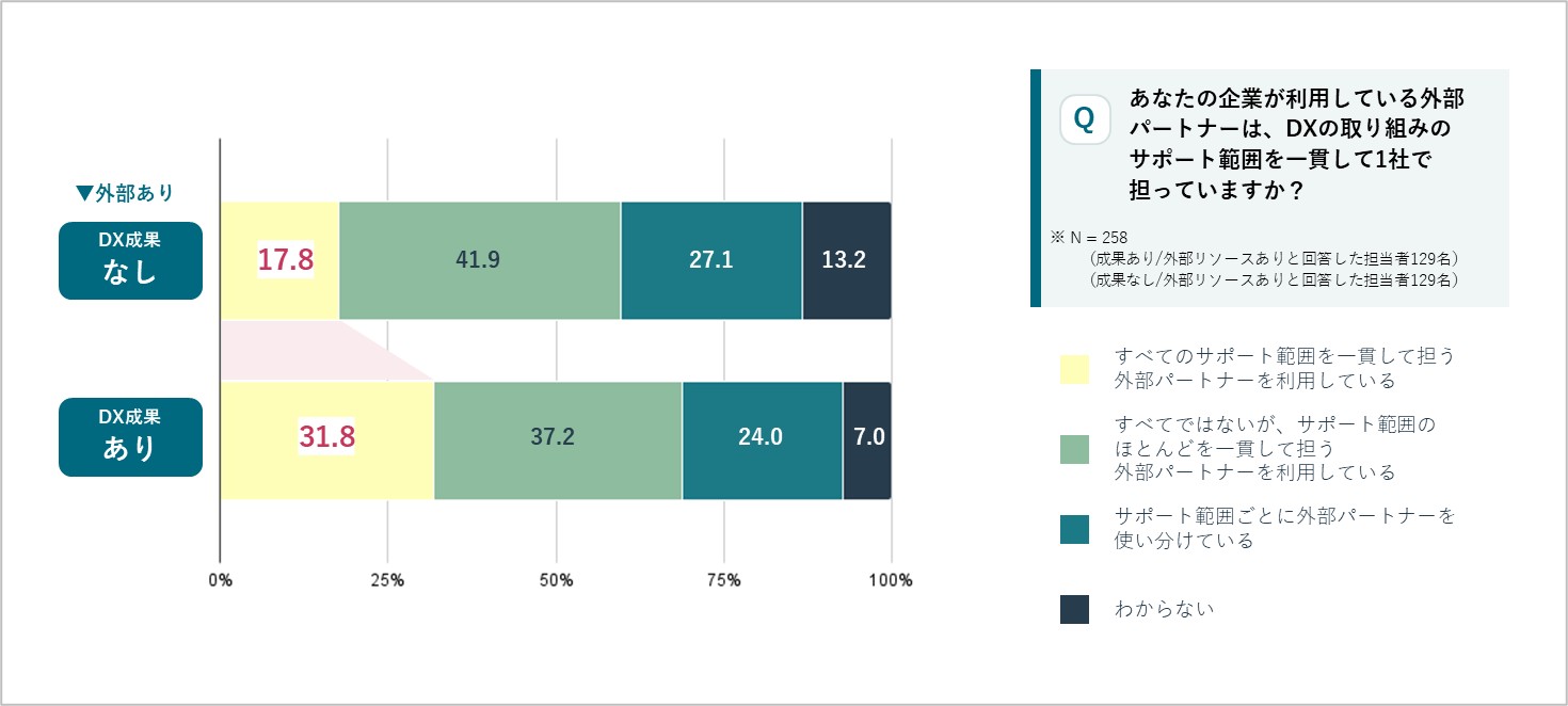 DXで成果を出した企業のうち、完全に一貫したサポートを外部パートナー1社から受けている割合は31.8%に上り、成果を出していない企業の17.8%を大きく上回っています。このデータから、パートナーに上流から下流まで一貫してサポートを依頼することが、DXの成果につながる一因だと考えられます。