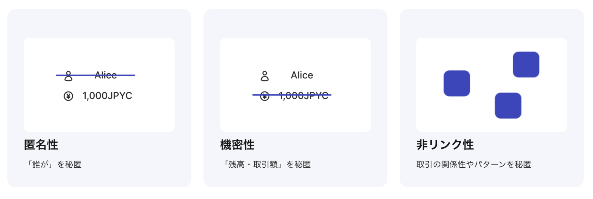 特に、「匿名性(送信者や受信者の秘匿)」や「機密性(残高や取引額の秘匿)」に加え、「非リンク性」、すなわち取引同士の関係性やパターンを第三者に推測されない設計が不可欠です。匿名性や機密性が担保されていても、取引パターンの分析から企業や個人が特定される可能性があるためです。