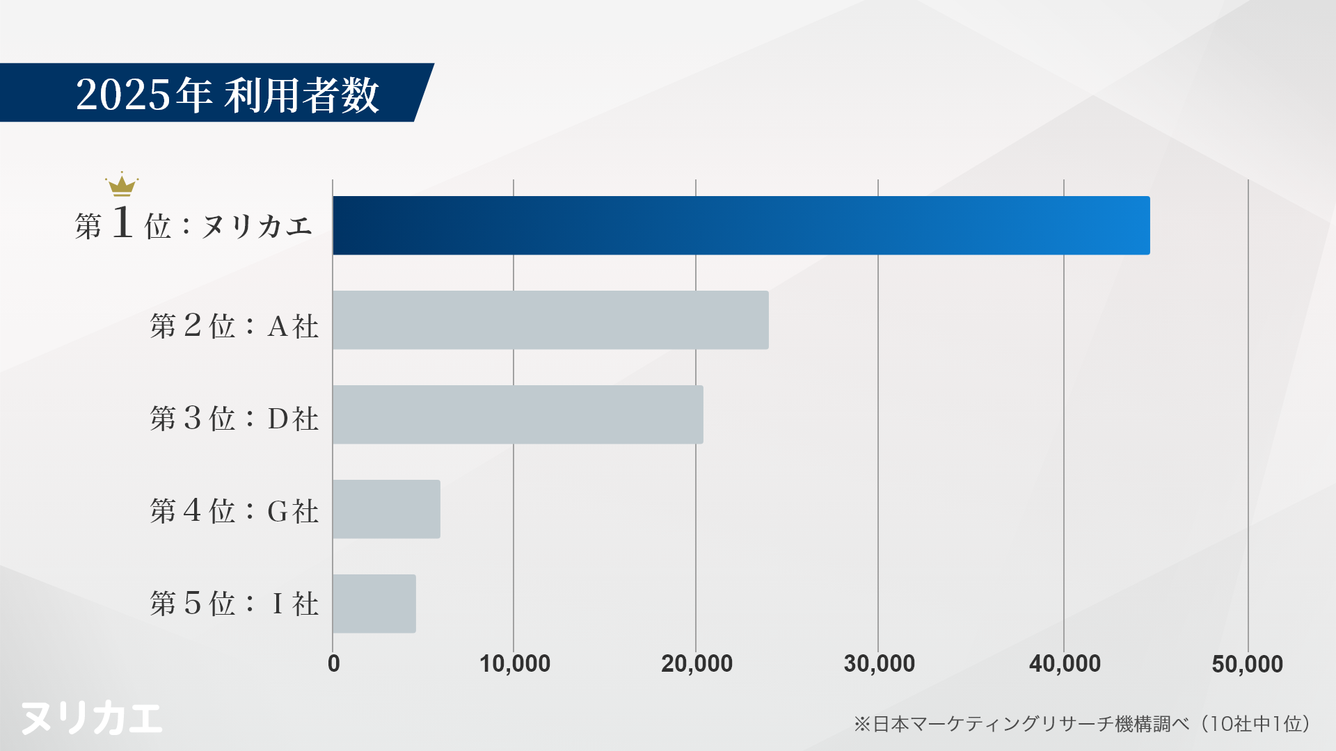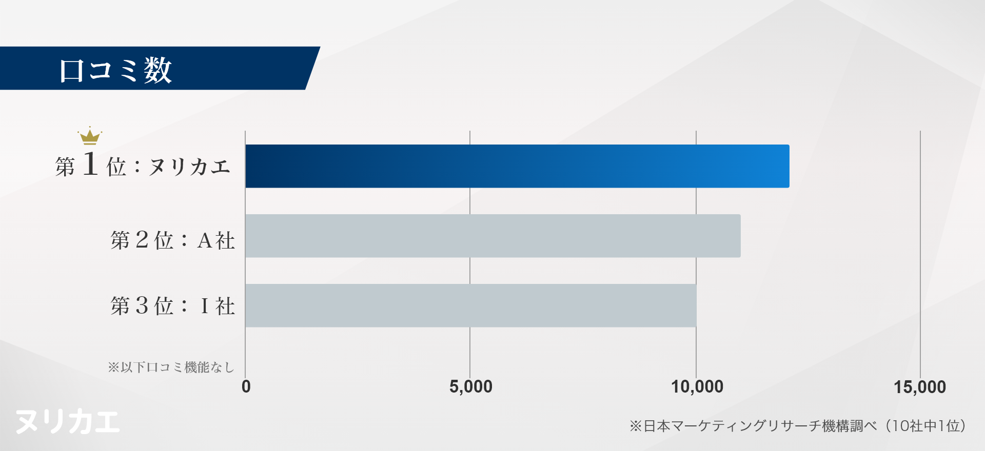 対象10社中、ユーザーによるリアルな口コミを掲載しているサービスは3社のみであり、その中でも「ヌリカエ」が最多の口コミ数となりました。透明性の高い情報提供により、後悔しない会社選びをサポートしています。