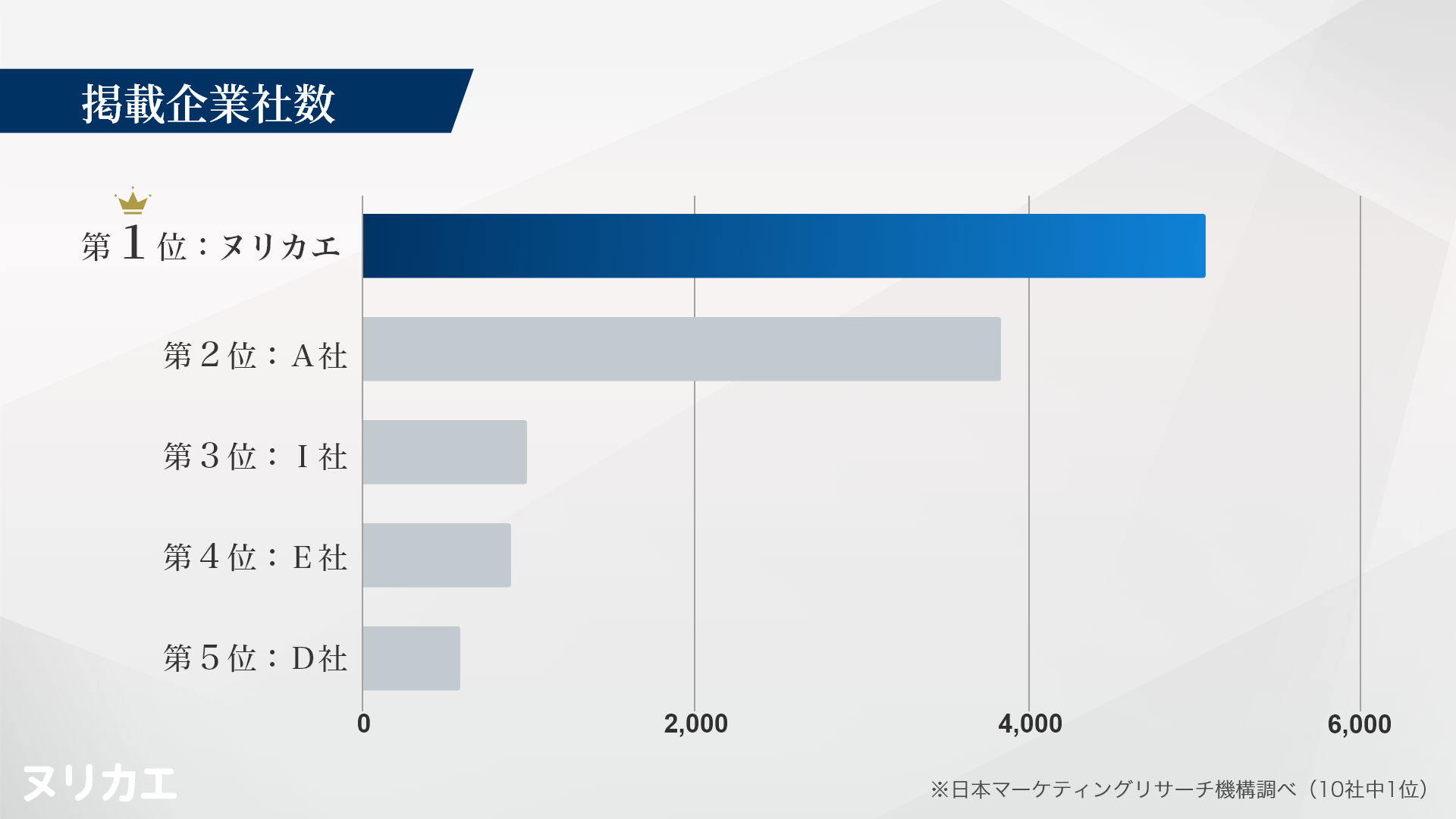 ユーザーに紹介可能な加盟企業の掲載数を調査した結果、「ヌリカエ」が最も多い掲載数となりました。全国各地の施工会社様と提携しているため、ユーザーの居住地域や細かなニーズに合わせた最適な会社のご紹介が可能です。
