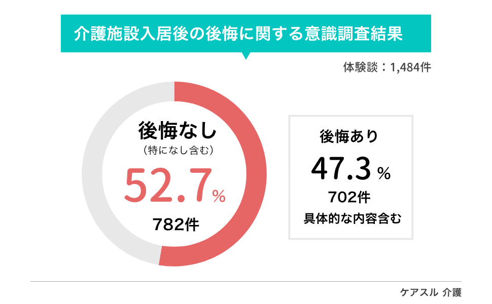 体験談1,484件のうち、「特に後悔なし」が52.7%(782件)、具体的な後悔・改善要望ありが47.3%(702件)。