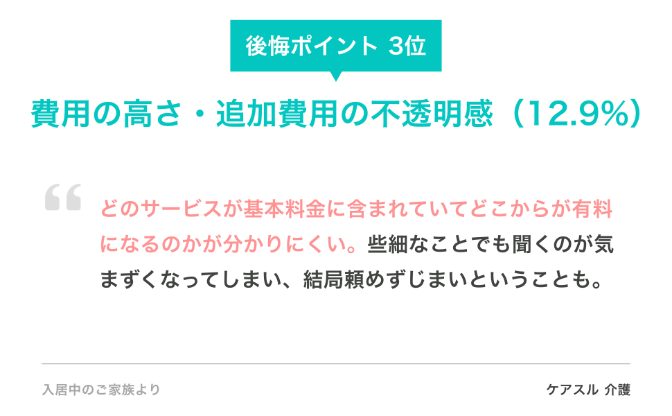 費用面では、「どのサービスが基本料金に含まれていてどこからが有料になるのかが分かりにくい。些細なことでも聞くのが気まずくなってしまい、結局頼めずじまいということも」(入居中の家族)という声のほか、「もう少し利用しやすい価格設定であれば、もっと長くお世話になりたかった」(退去済みの家族)と、費用が退去の直接的な要因となったケースもありました。