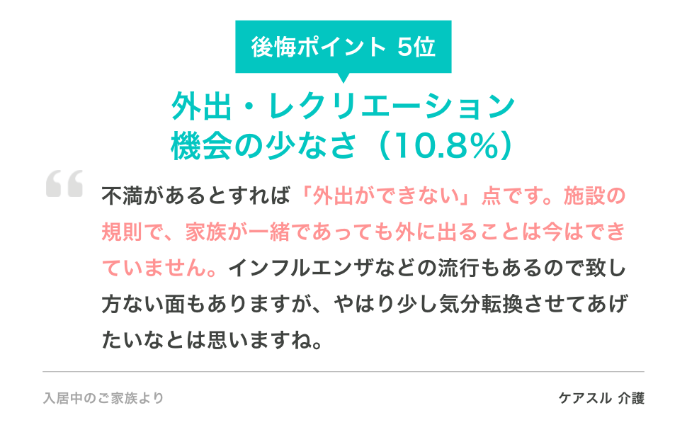 外出・レクリエーションの機会については、「不満があるとすれば『外出ができない』点です。施設の規則で、家族が一緒であっても外に出ることは今はできていません。インフルエンザなどの流行もあるので致し方ない面もありますが、やはり少し気分転換させてあげたいなとは思いますね」(入居中のご家族)という声がありました。