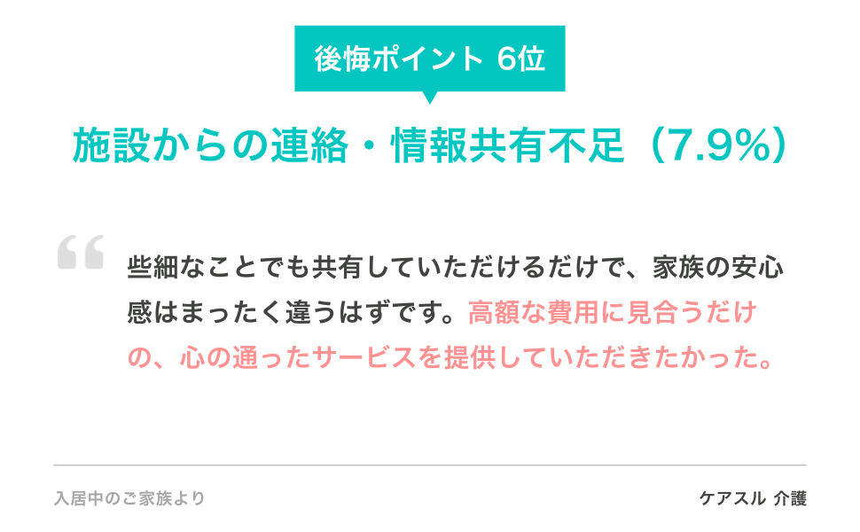 3位 「費用の高さ・追加費用の不透明感(12.9%)」、4位 「面会制限(12.7%)」 と、入居前の見学や検討段階では実態を把握しにくい課題が浮き彫りに。 - 5位以下に共通する、施設と家族の「情報格差」という構造的課題。